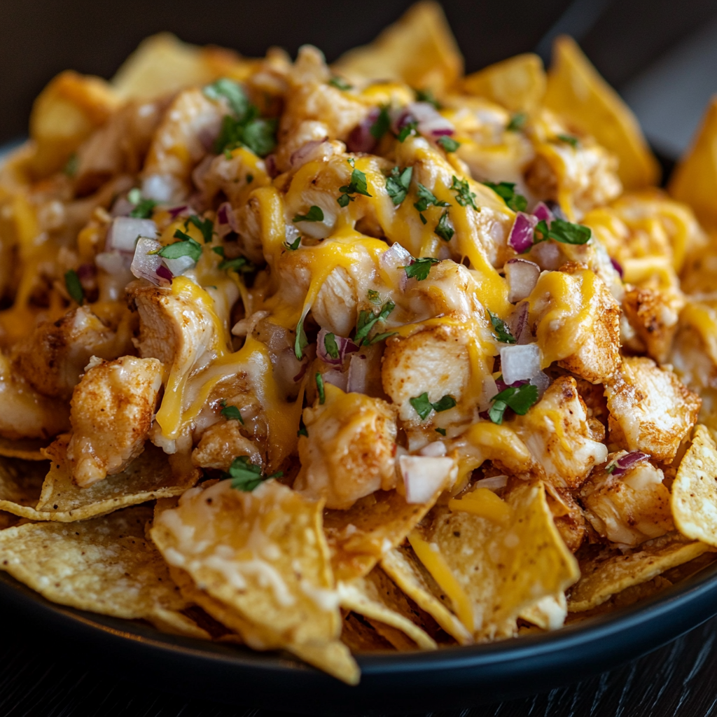 Ingredients: Tortilla chips of your choice, grilled chicken strips, sautéed onions, green peppers, melted provolone cheese, and creamy nacho cheese sauce.