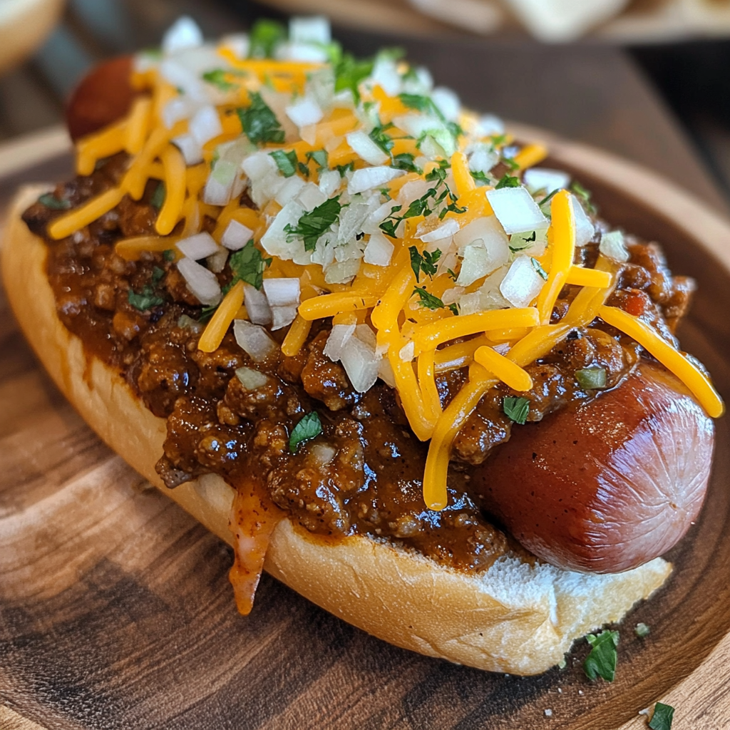 - Grilled Polish sausage topped with hearty chili, melted cheddar cheese, and diced onions, served on a fresh bun.